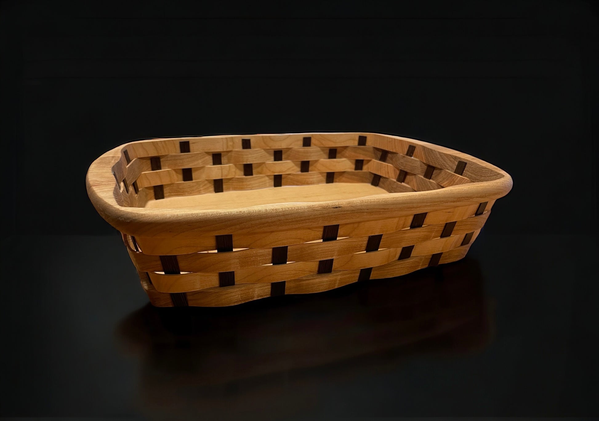This basket can be purchased in either cherry or maple, both of which are native woods to North America. The stakes (vertical pieces) are cut from wenge, an exotic wood type from Africa. Each wood is left in its natural color, and the basket is finished in boiled linseed oil to preserve the natural color and also to act as a protection for the wood. Grains and wood colorations may vary from photos.