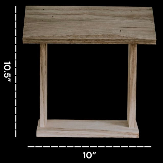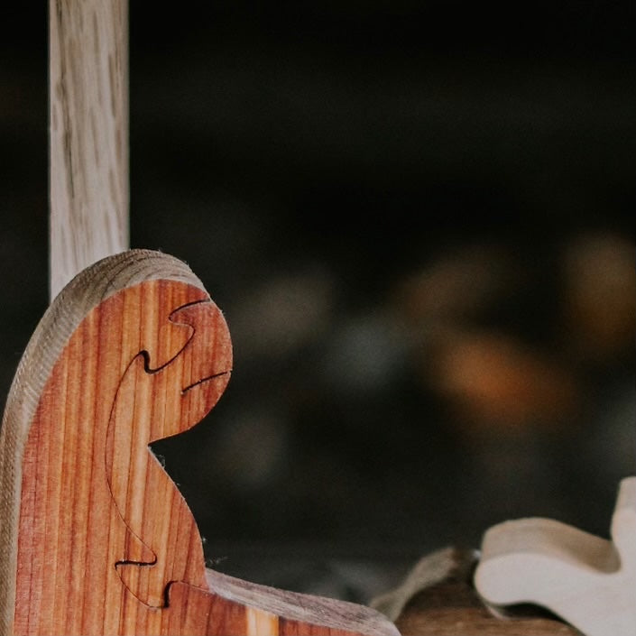 This nativity is crafted from several different wood types. The stable, baby Jesus, and the sheep are maple; Mary & Joseph are aromatic red cedar; the wisemen are walnut; and the shepherds are poplar.
