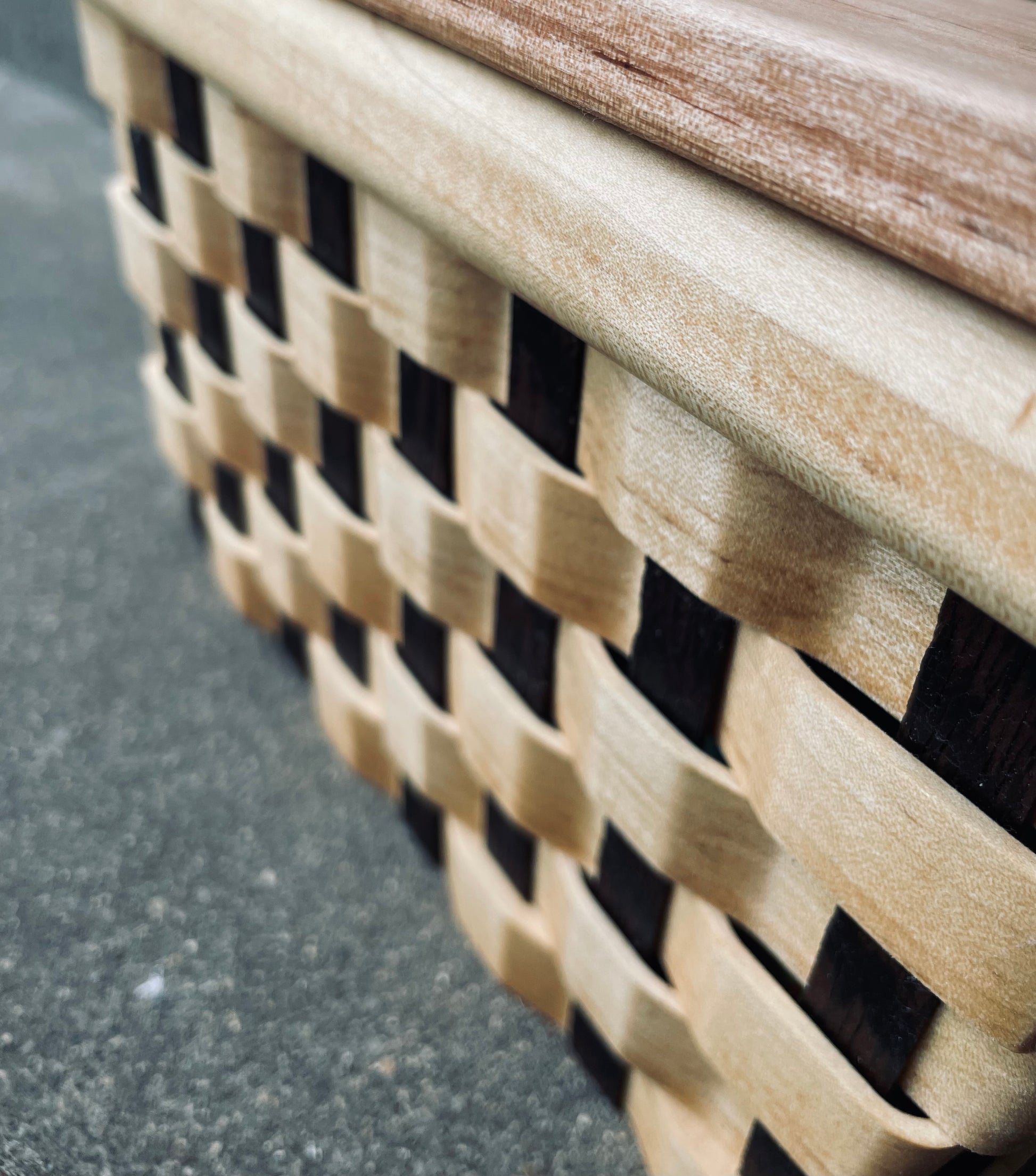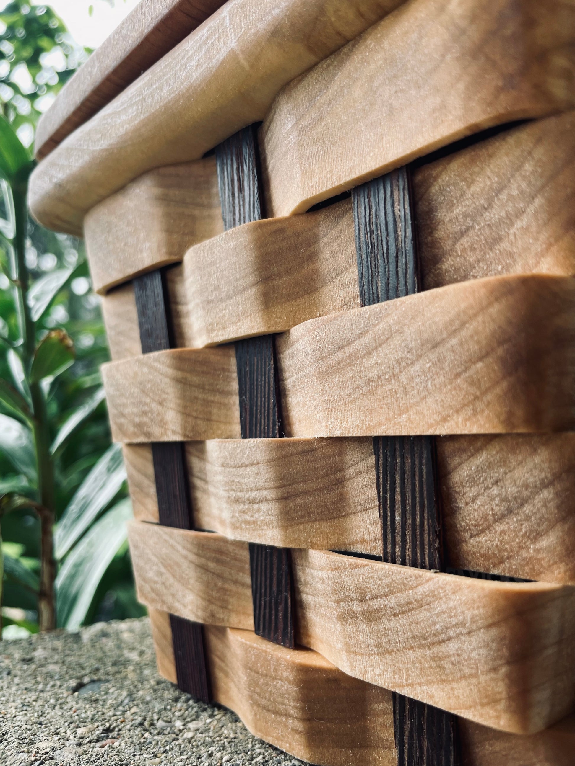 It is crafted from maple, a North American hardwood, and the stakes (black vertical pieces) are wenge, an African exotic wood. Each wood is left in its natural color, and the basket is finished in boiled linseed oil to preserve the natural color and also to act as a protection for the wood. Grains and wood colorations may vary from photos.