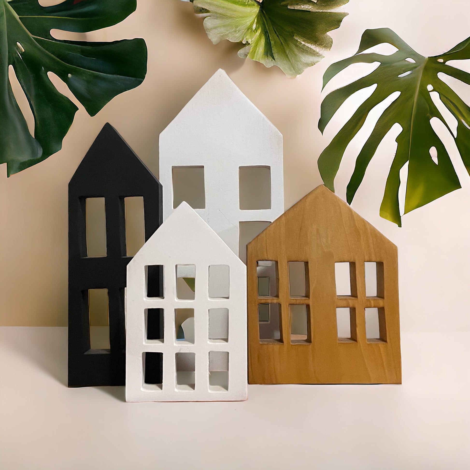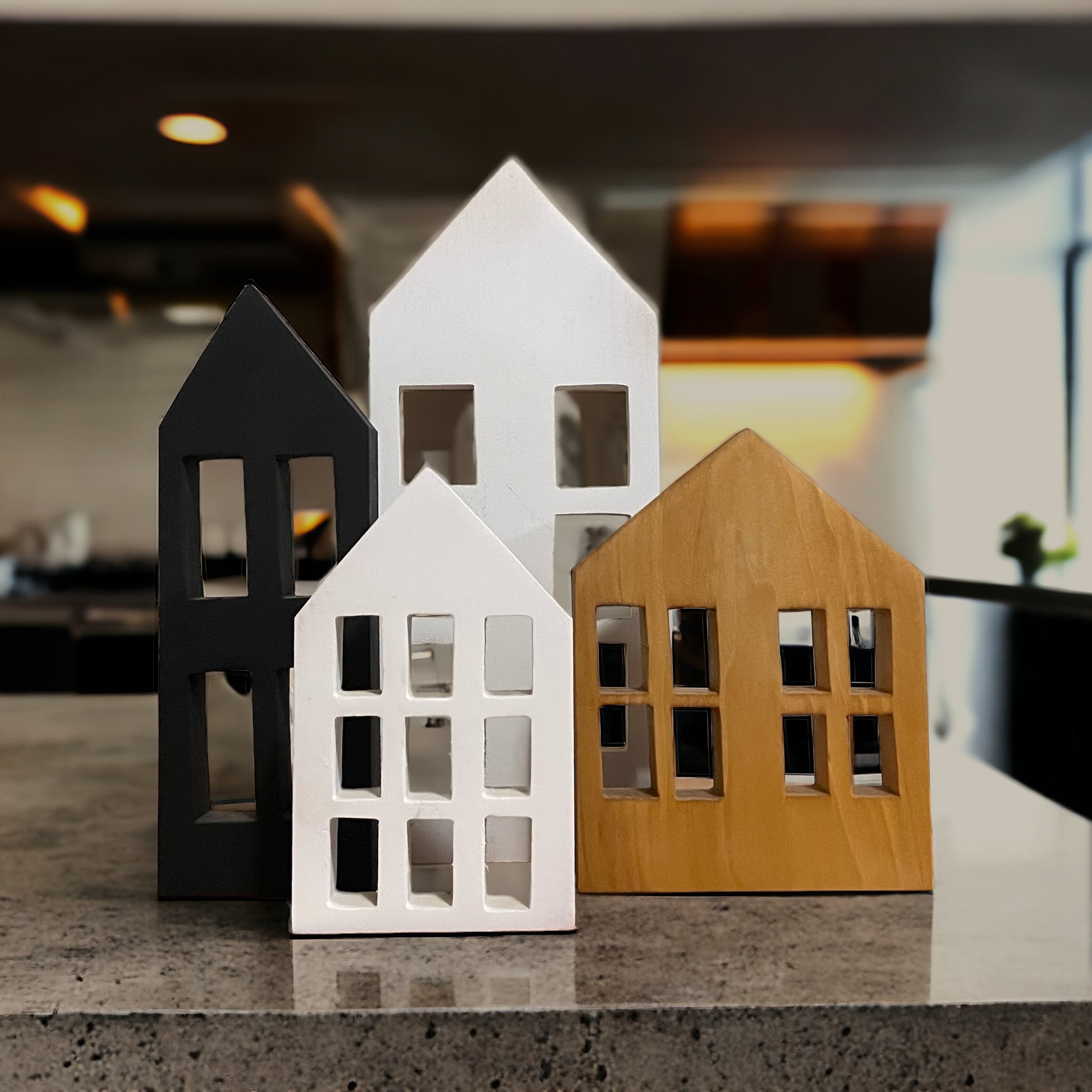 These sets are cut from North American hardwoods. The black house is painted black, and the two white houses are painted white. One of the houses, however, we simply leave in its natural color, brown maple.
